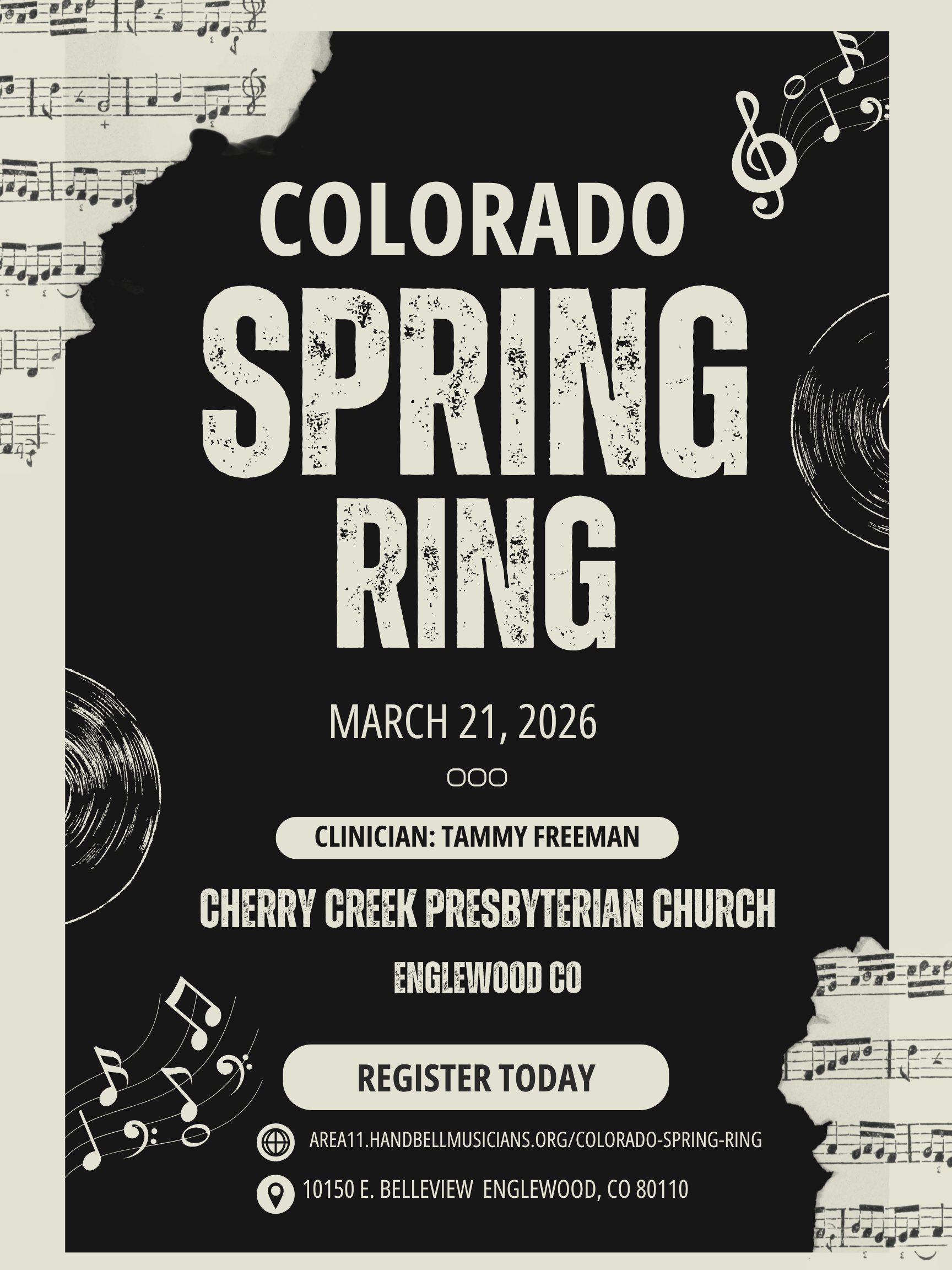 This day-long mass ringing event welcomes a new clinician each year to Area 11! This is your opportunity to ring with handbell musicians from Colorado and perform for a local audience.
