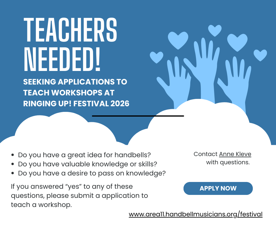 What is a Festival? A festivals is a gathering of handbell musicians who love the instrument, the music it makes, and the community it creates. The Area XI 2026 Festival begins in the late afternoon of Thursday, June 11 and ends by 12 noon on Sunday, June 15. There are two main components: