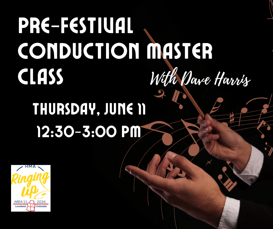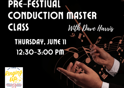 Our Ringing Up! Festival 2026 will offer an optional Pre-Festival Conducting Master Class on Thursday, June 11, 2026 from 12:30 – 3:00 pm. This pre-festival event will allow 10 conductors the opportunity to spend 10-15 minutes working on 1 music selection of your own choice with Dave Harris. Conductors will need to bring a piece of music to work on with at least 10 copies for the ringers and clinician. There will be three types of participants: Conductors, Ringers, and Observers. This experience is limited to 10 Conductors, 13 Ringers, and there is no limit of Observers. Participants must be registered for the Festival in order to participate. Space is limited and first come, first served.